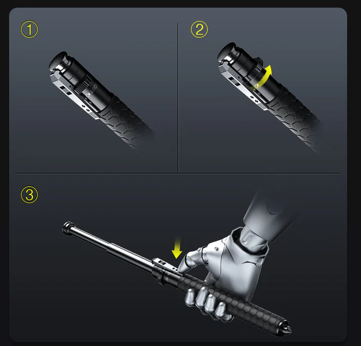 Con un solo movimiento, el bastón se transforma en tu escudo de confianza. El agarre antideslizante ofrece control absoluto y golpes precisos. No importa si es de noche o llueve, siempre te sentirás protegido.
