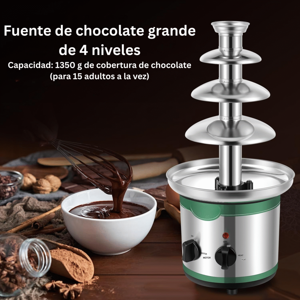 Esta fuente de 4 niveles crea un impresionante flujo de chocolate, ideal para fiestas, bodas y eventos elegantes.