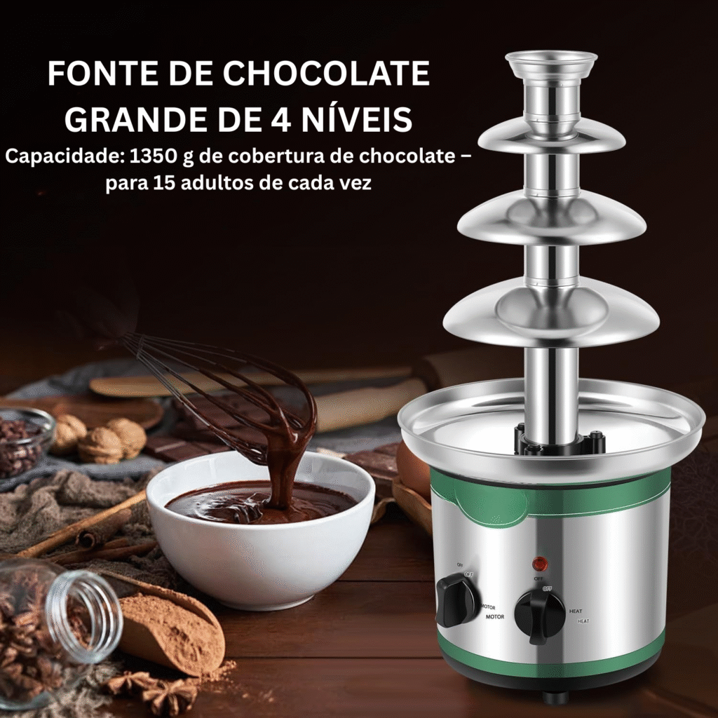 A fonte funciona na perfeição não só com chocolate, mas também com diversos molhos, acrescentando um toque de elegância a qualquer evento.