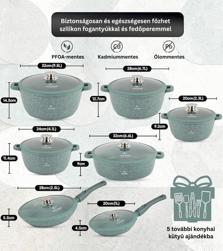 Ez az edénykészlet 100%-ban PFOA-, kadmium- és ólommentes anyagokból készült, így biztosítva az egészséges és biztonságos főzést. A gránitbevonat megvédi az ételt az odaragadástól, a levehető szilikon fogantyúk pedig főzés közben hűvösek maradnak. Minden tűzhelyen és sütőben használható, a tisztítás gyors és egyszerű. A készlet 5 extra ajándék konyhai eszközt is tartalmaz – a teljes főzési élményért!