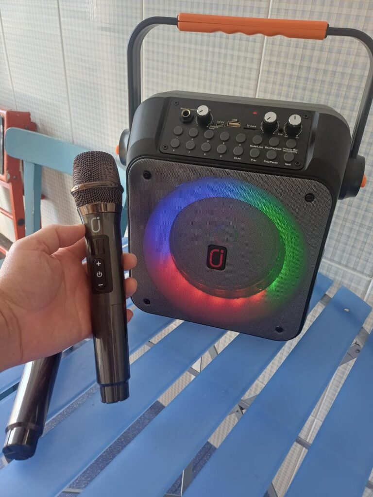 Spaß für die ganze Familie Unsere Kinder haben es geliebt zu singen, und wir Erwachsenen hatten auch viel Spaß mit Karaoke-Wettbewerben. Sehr tragbar und leicht mitzunehmen, klarer Sound auch draußen.