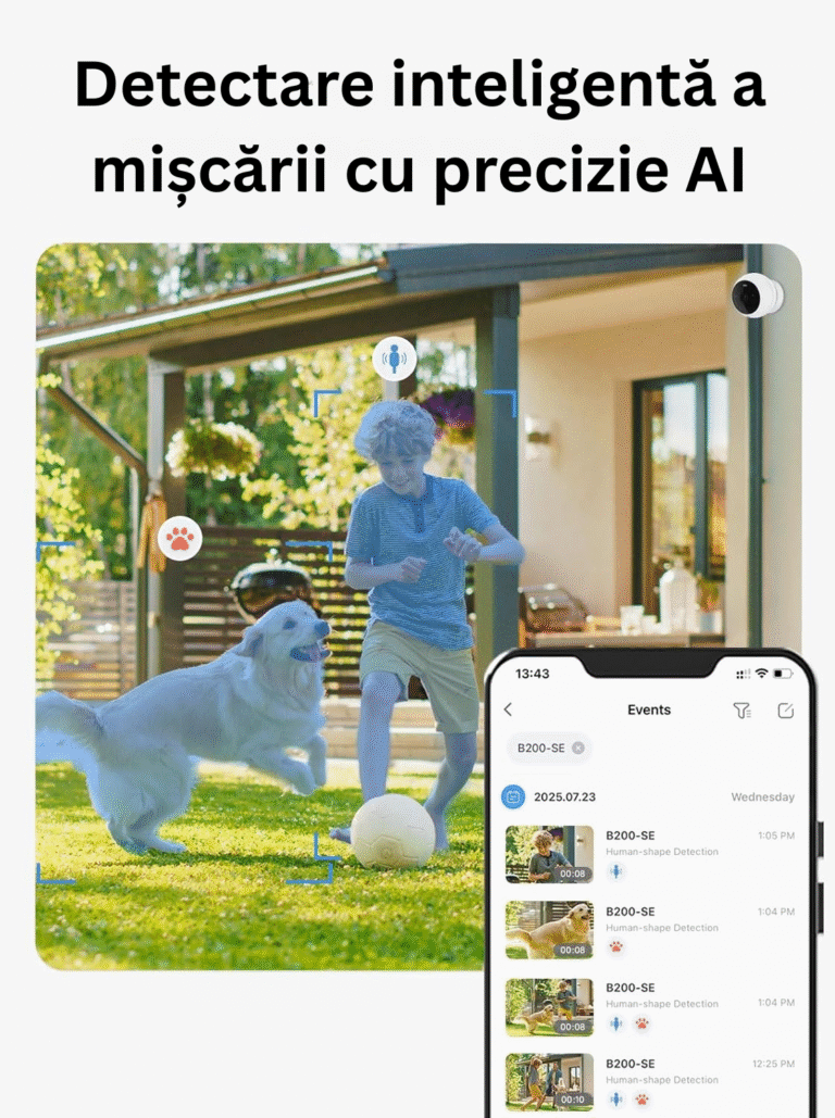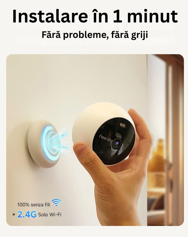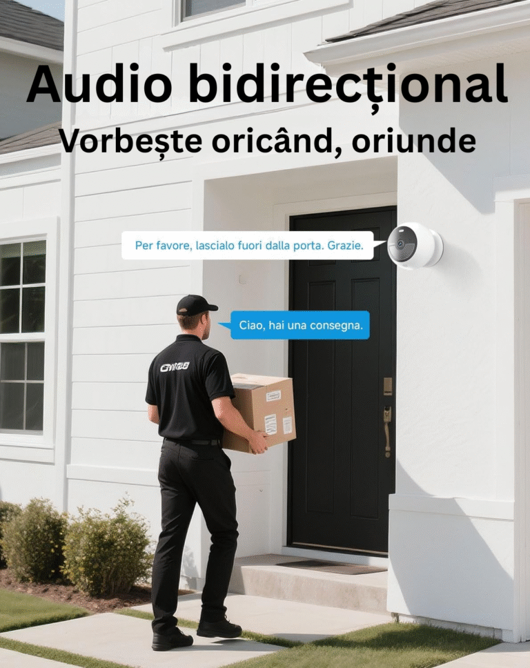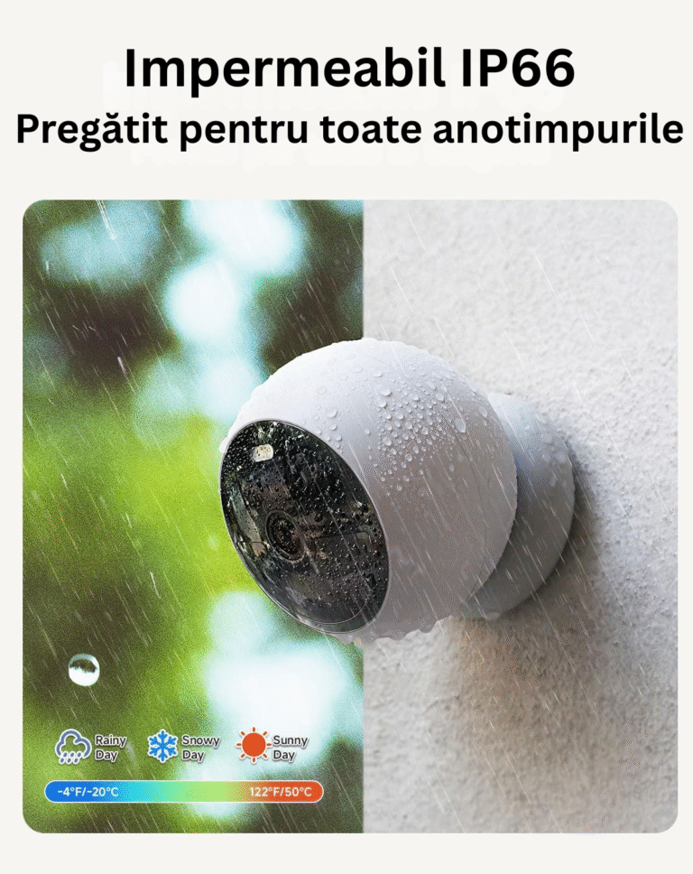 Construcția durabilă, certificată IP66, rezistă la ploaie, praf, zăpadă și temperaturi extreme. Funcționează perfect atât la interior, cât și la exterior, indiferent de sezon. Stocarea internă de 8GB îți păstrează toate înregistrările fără abonamente suplimentare. Panoul solar inclus asigură alimentare continuă, transformând camera într-un sistem complet autonom.