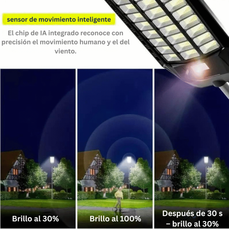Equipada con un sensor de movimiento con IA, la lámpara detecta automáticamente la presencia y aumenta su brillo al 100%. Tras 30 segundos sin movimiento, vuelve al 30%, ahorrando energía y respetando el medio ambiente.