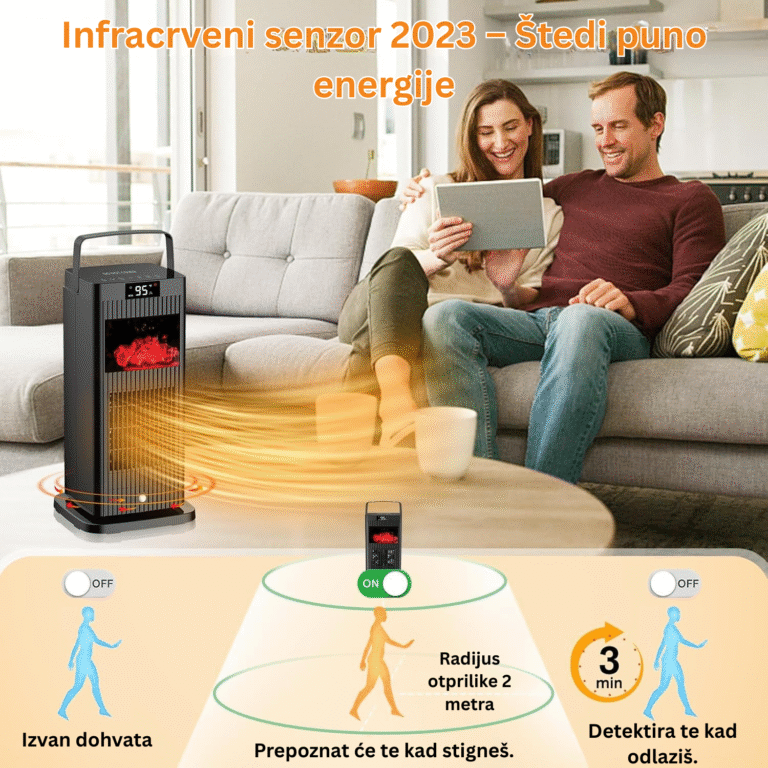Prijenosni grijač s ventilatorom iz 2023. omogućuje brzo zagrijavanje za samo 3 sekunde, zahvaljujući PTC keramičkoj tehnologiji i širokoj oscilaciji koja ravnomjerno raspoređuje toplinu po prostoriji. Infracrveni senzor automatski detektira prisutnost i uključuje ili isključuje uređaj, štedeći energiju i pružajući dodatnu udobnost. S realističnim efektom kamina, ultra tihim radom i integriranom ETL zaštitom, idealan je izbor za spavaću sobu, ured ili garažu.