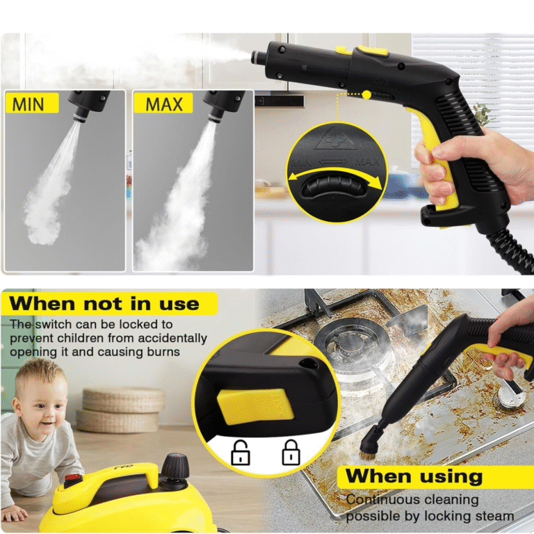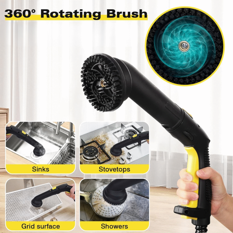 Gorąca para osiąga wysoką temperaturę, skutecznie usuwając bakterie i zanieczyszczenia z każdej powierzchni. System blokady pary chroni przed przypadkowym uwolnieniem gorącej pary i zwiększa bezpieczeństwo użytkowania. W zestawie znajdują się szczotki mosiężne i nylonowe, nakładki z mikrofibry, rękawice odporne na temperaturę, adapter parowy i szczotki obrotowe. Doskonała do płytek, fug, okien, kanap, ubrań, zlewów i wnętrza samochodu.