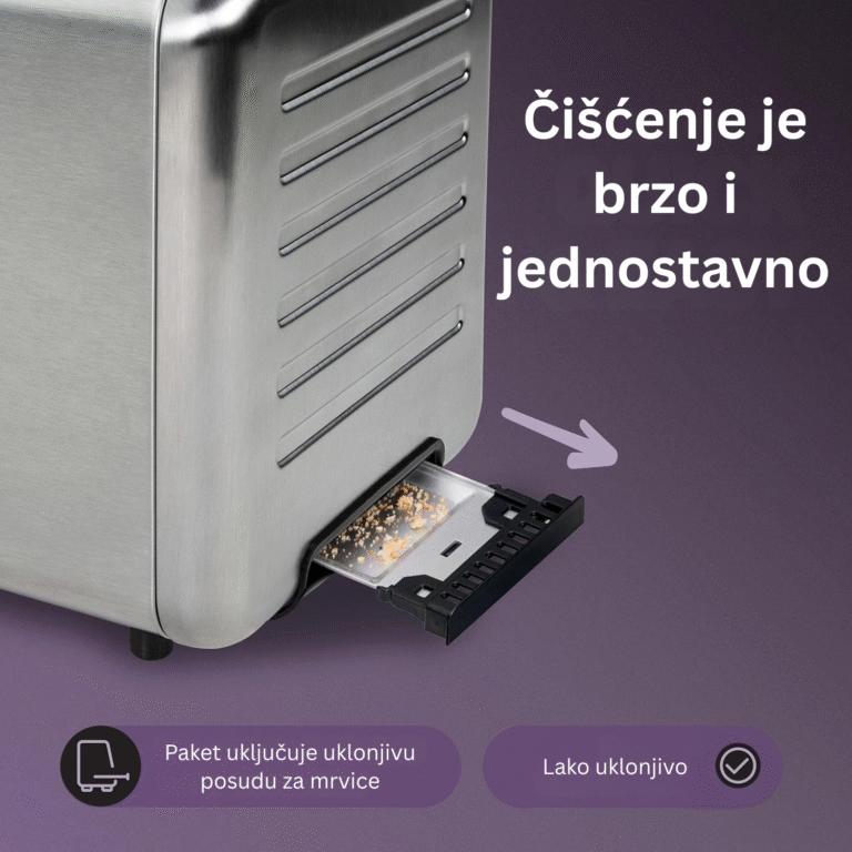 Izrađen od izdržljivog nehrđajućeg čelika, toster dodaje dašak elegancije vašoj kuhinji. Uklonjiva posuda za mrvice i sustav protiv blokiranja čine ga izuzetno sigurnim i jednostavnim za održavanje. Savršen je izbor za moderan način života i bezbrižno korisničko iskustvo.