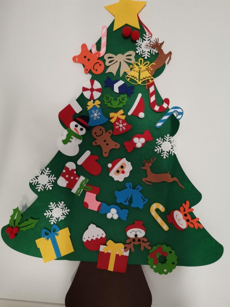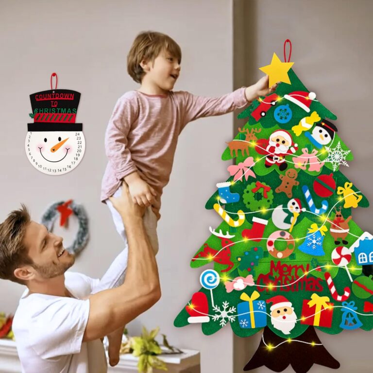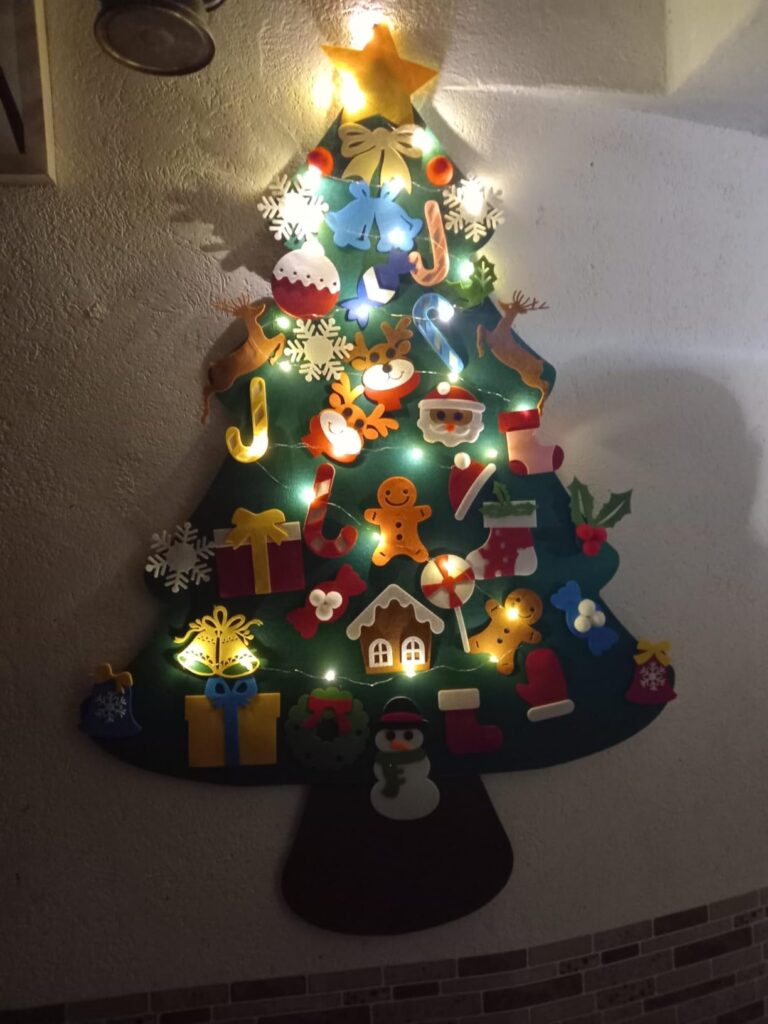 Brăduțul este însoțit de o bandă LED alimentată cu baterii, adăugând un efect vizual spectaculos. Lumina caldă pune în valoare ornamentele și creează un decor festiv unic. Ideal pentru camerele copiilor, grădinițe sau colțuri tematice de Crăciun.
