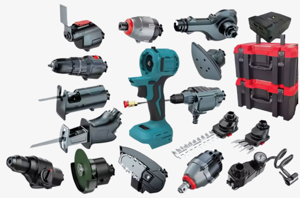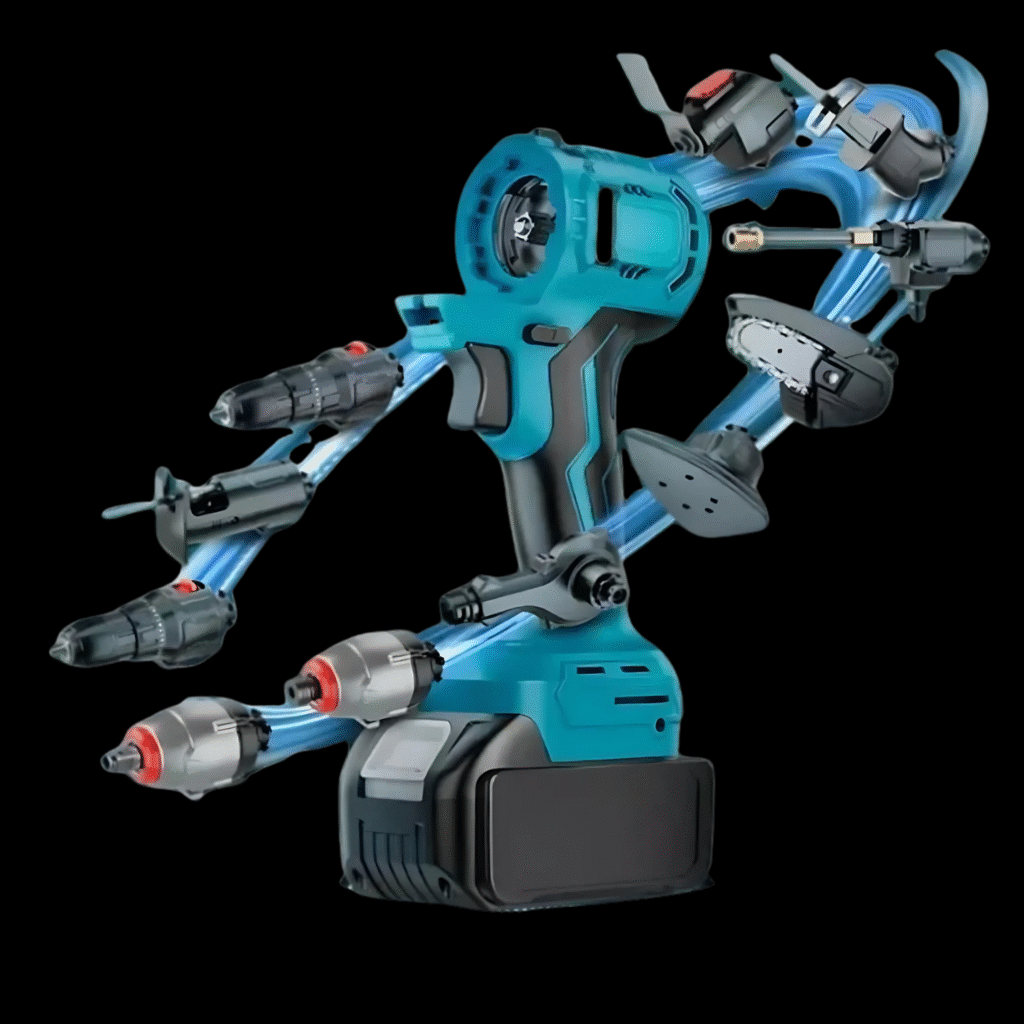 Set uključuje: 48V bezčetkičnu višenamjensku mašinu, glavu bušilice, glavu udarnog ključa, mini glavu motorne pile, glavu recipročne pile s 2 oštrice, 48V bateriju, punjač s šinom, perač pod pritiskom, puhalicu i elegantnu kutiju za pohranu.